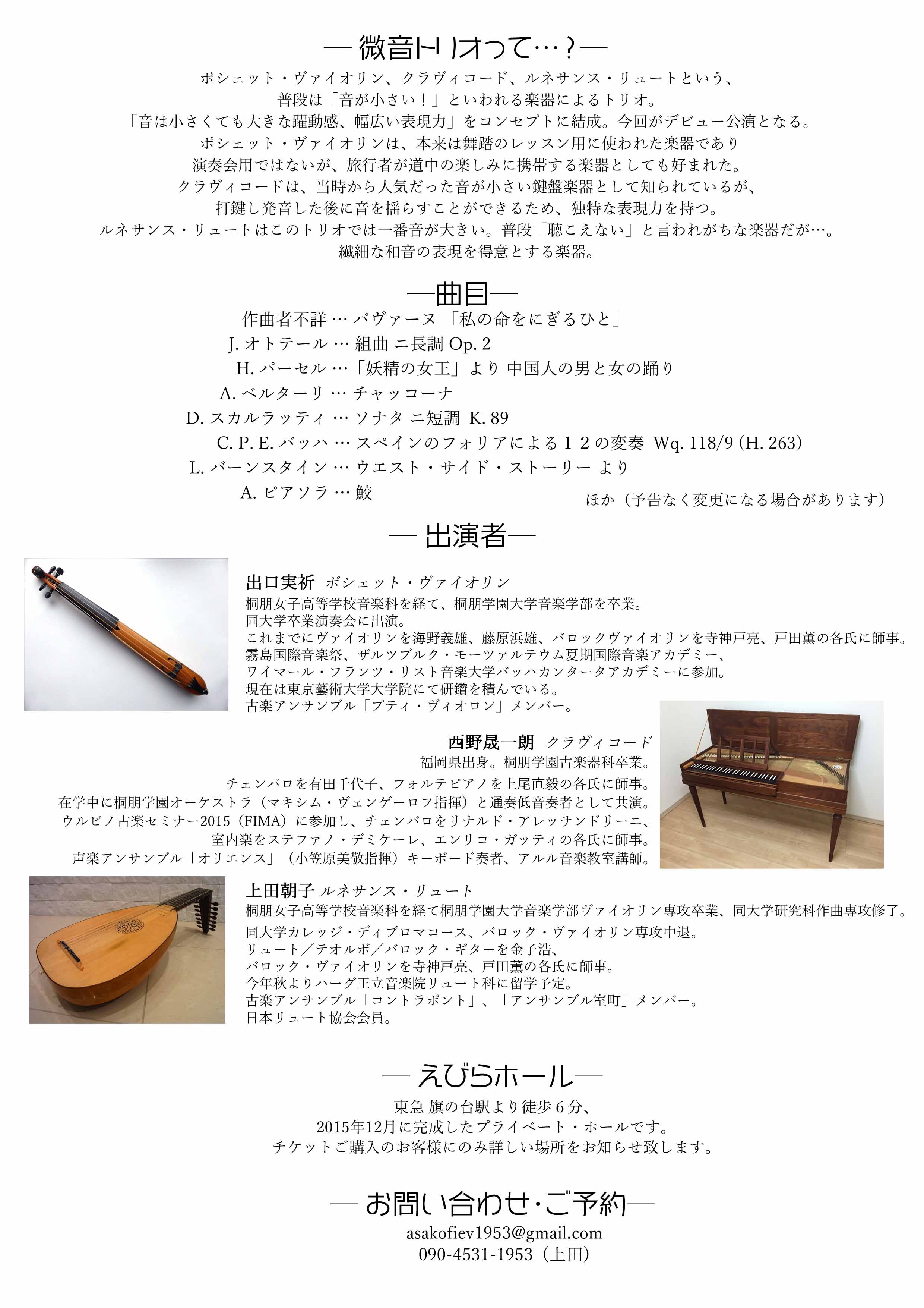 出演:出口実祈(ポシェット・ヴァイオリン)、西野晟一朗(クラヴィコード)、上田朝子(ルネサンス・リュート)